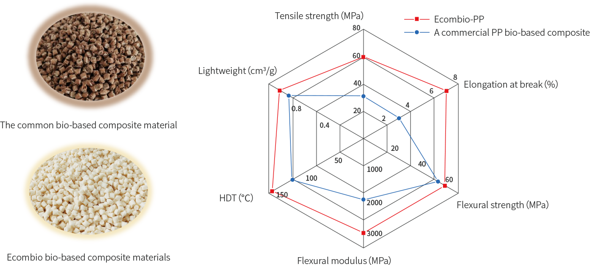 ECOMBIOThe Ecombio series biobased composite materials use nanofibers extracted from plants as fillers, and are fully modified and fused with polymer matrices through unique liquid-phase mixing technology. Compared with traditional biobased composite materials, the Ecombio series products have the advantages of light color, low odor, high mechanical properties, and good heat resistance, achieving a comprehensive improvement in the performance of biobased composite materials.