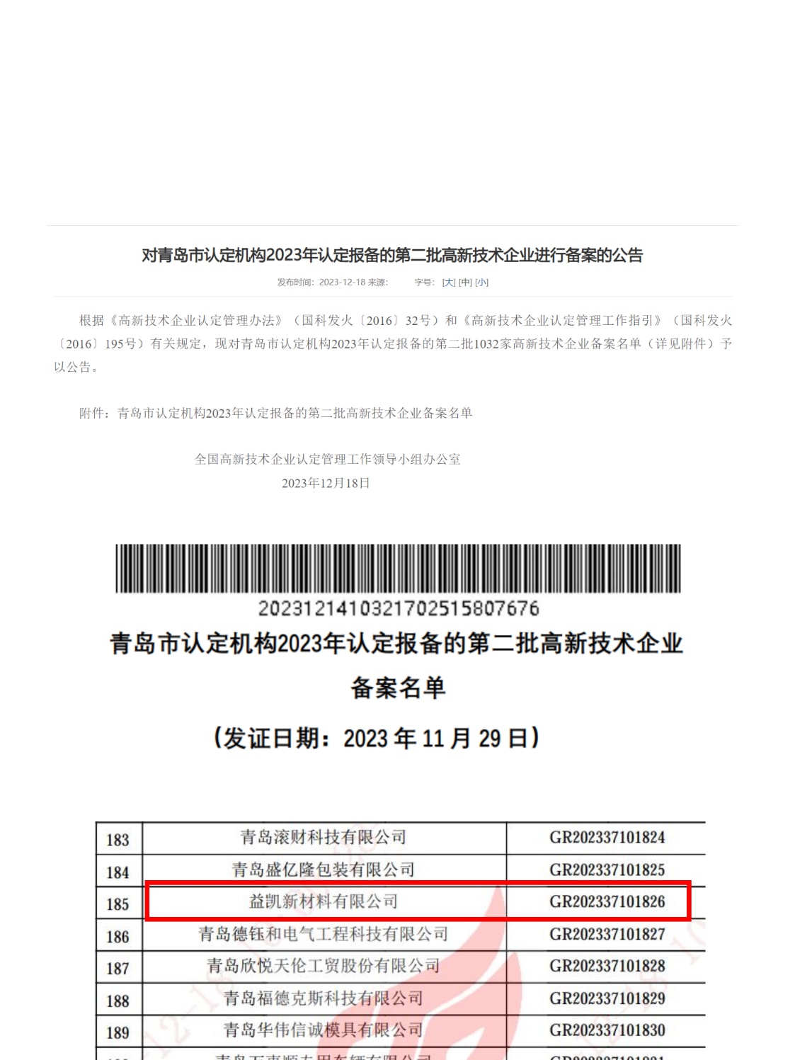 2023年12月18日,全國高新技術企業(yè)認定管理工作領導小組辦公室根據(jù)《高新技術企業(yè)認定管理辦法》(國科發(fā)火{2016}32號)和《高新技術企業(yè)認定管理工作指引》(國科發(fā)火{2016}195號)有關規(guī)定,對青島市認定機構2023年認定報備的第二批1032家高新技術企業(yè)進行備案。益凱新材料有限公司通過青島市認定機構2023年高新技術企業(yè)備案,成功獲得國家高新技術企業(yè)認證。此次高新技術企業(yè)成功認證標志著益凱新材料有限公司經過多年發(fā)展,在技術實力、經營管理、財務實力等方面均達到國際高新技術企業(yè)認證要求,獲得國家和行業(yè)的認可和肯定。